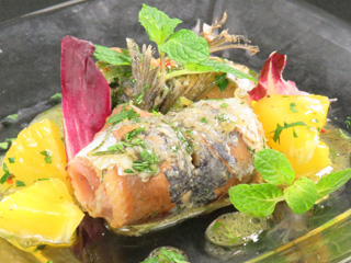 サフラン風味のスープの中でゆるやかに火を通しふっくらと仕上げました